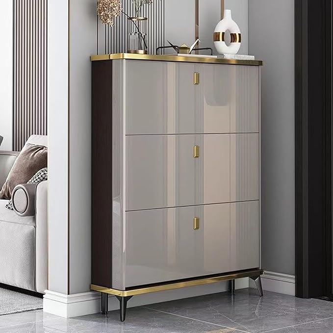 - ★ ★[Modern Delux Appearance]★ ★ – The elegant gray appearance with modern simple gold lines and gold pull handle, this slim shoe cabinet delivers a sense of fashion and minimalist taste. No matter where it is placed, it can be perfectly integrated into your modern room style.